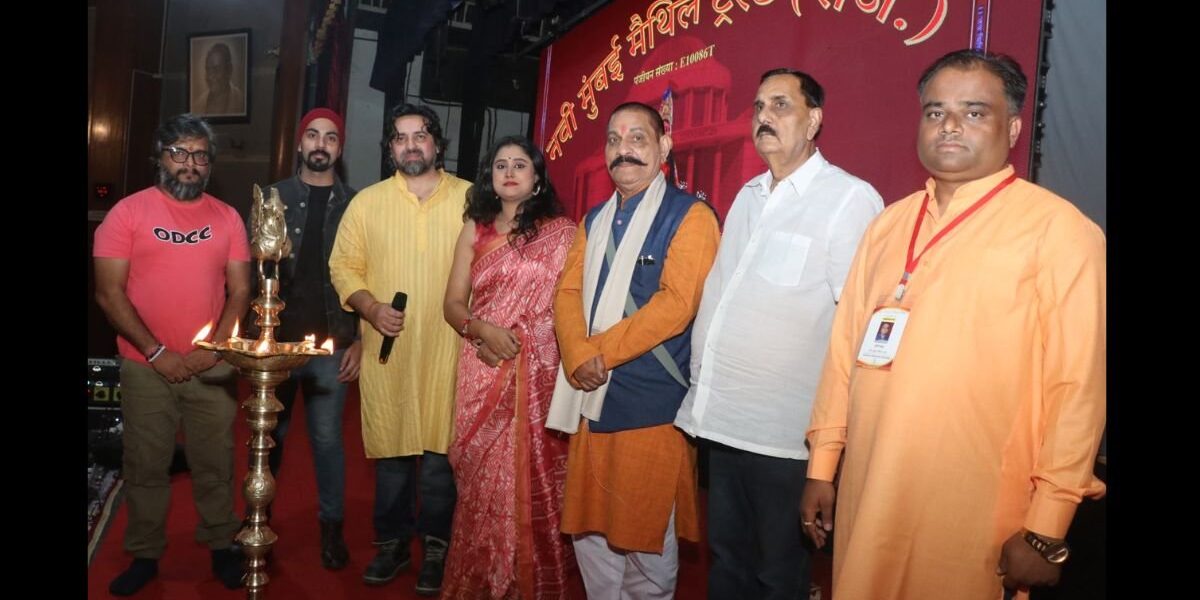 नवी मुम्बई मैथिल ट्रस्ट के मुरारी ठाकुर , वरिष्ठ समाज सेवी शुभचंद्र मिश्रा,श्री जय नारायण झा ,”नूनरोटी” मैथिली वेबसीरीज के निर्माता- निर्देशक श्विकास झा , रौशनी झा और कलाकार आदर्श भारद्वाज साथ में वरिष्ठ साउंड इंजीनियर श्री शंकर सिंह जी