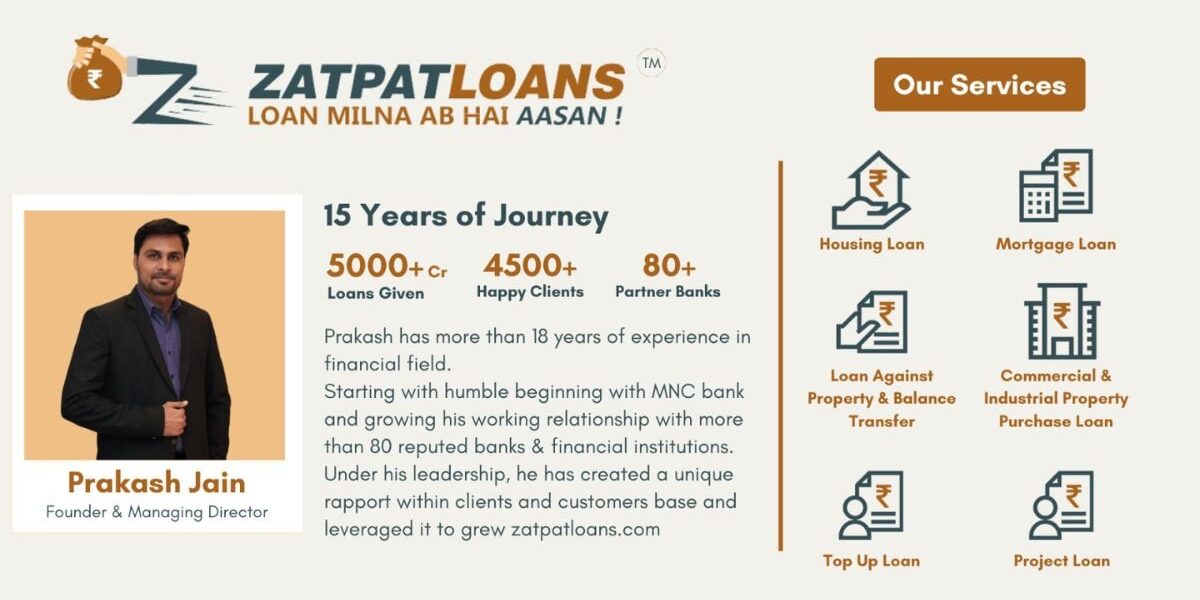 ZATPAT LOANS एक फाइनेंसियल संस्था है जिसे मिस्टर प्रकाश जैन ने बनाया है और इसका मुख्य उद्देश्य हाउसिंग लोन, मोर्टगेज लोन, बिजनेस लोन, पर्स्नल लोन को व्यक्तियों और व्यापारों को प्रदान करना है। मिस्टर प्रकाश जैन के 17 साल के फाइनेंसियल संबंधी अनुभव के साथ, इसने अपने नेतृत्व में ग्राहकों और उपभोक्ताओं के साथ एक विशेष संबंध बनाया है और इसे बढ़ाने के लिए उपयोग किया है।